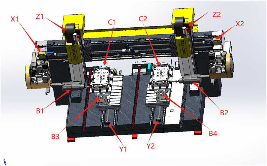 2相當(dāng)于2臺(tái)機(jī)器共用1數(shù)控系統(tǒng)1套床身,X1X2軸可單獨(dú)左右運(yùn)動(dòng)也可同時(shí)左右運(yùn)動(dòng),Y1Y2軸工作臺(tái)可單獨(dú)前后運(yùn)動(dòng)也可同時(shí)前后運(yùn)動(dòng),Z1Z2軸可單獨(dú)上下運(yùn)動(dòng)也可同時(shí)上下運(yùn)動(dòng),雙主軸擺頭定義為B1B2軸可單獨(dú)±110·旋角也可同時(shí)±110·旋角;搖籃軸定義為C1C2B3B4軸可正反面分工序加工也可加工兩個(gè)同樣的工件。